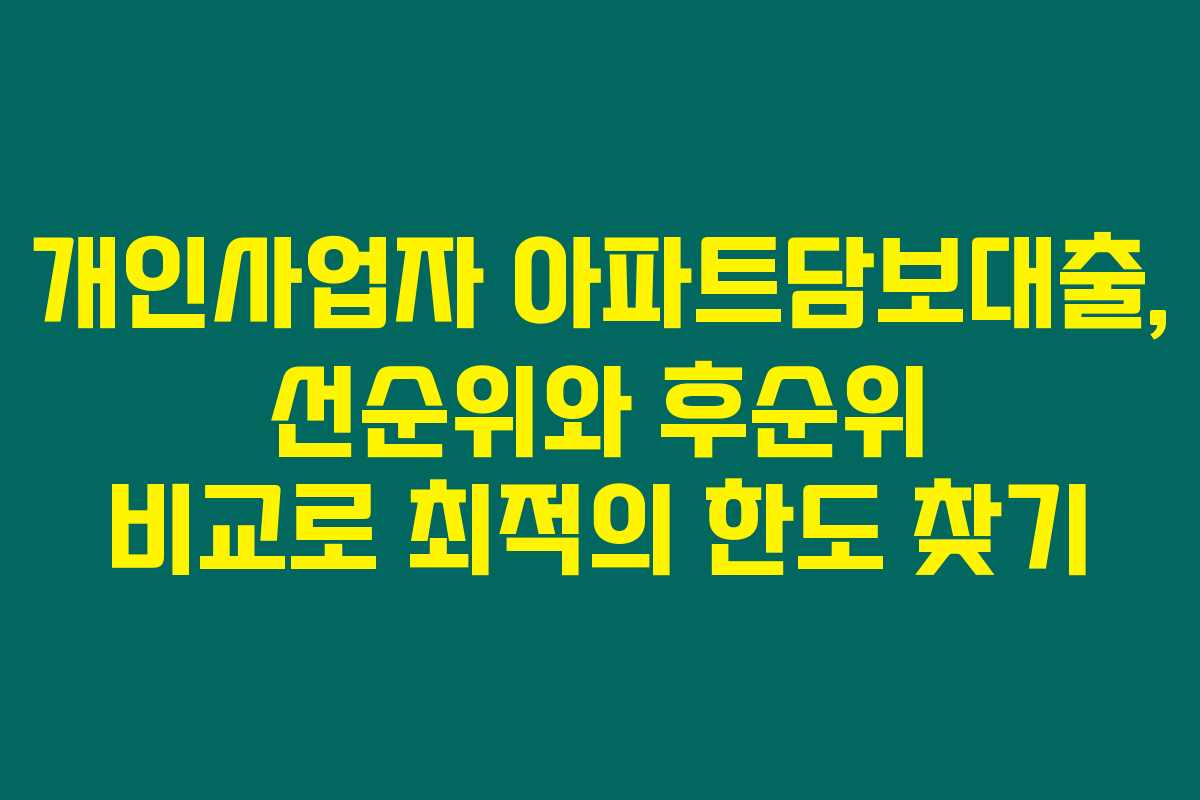 제가 알아본 바로는 개인사업자가 아파트담보대출을 받을 때, 선순위와 후순위 대출의 차이를 이해하면 훨씬 유리하게 대출을 받을 수 있습니다. 선순위와 후순위 각각의 한도 및 조건을 비교해보며, 어떤 방식이 더 적합한지 파악할 수 있도록 아래를 읽어보시면 좋을 것 같아요.