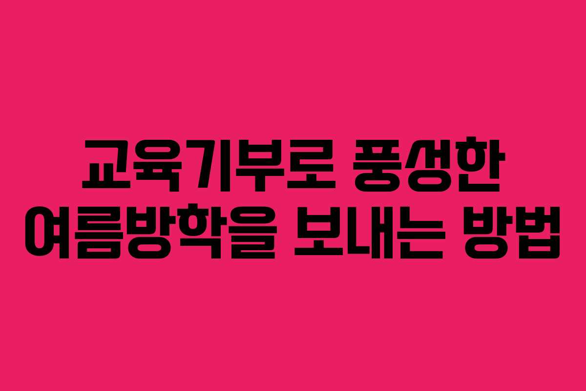 교육기부는 단순한 기부의 개념을 넘어, 교육의 질을 향상시키고 다양한 사회적 문제를 해결하는 데 기여할 수 있는 중요한 활동입니다. 여름방학을 맞아 다양한 교육기부 프로그램에 참여하여 의미 있는 경험을 쌓아보는 것은 매우 유익할 것입니다. 이처럼 교육기부는 학생과 교사 모두에게 풍성한 경험을 제공할 수 있는 기회를 열어줍니다.