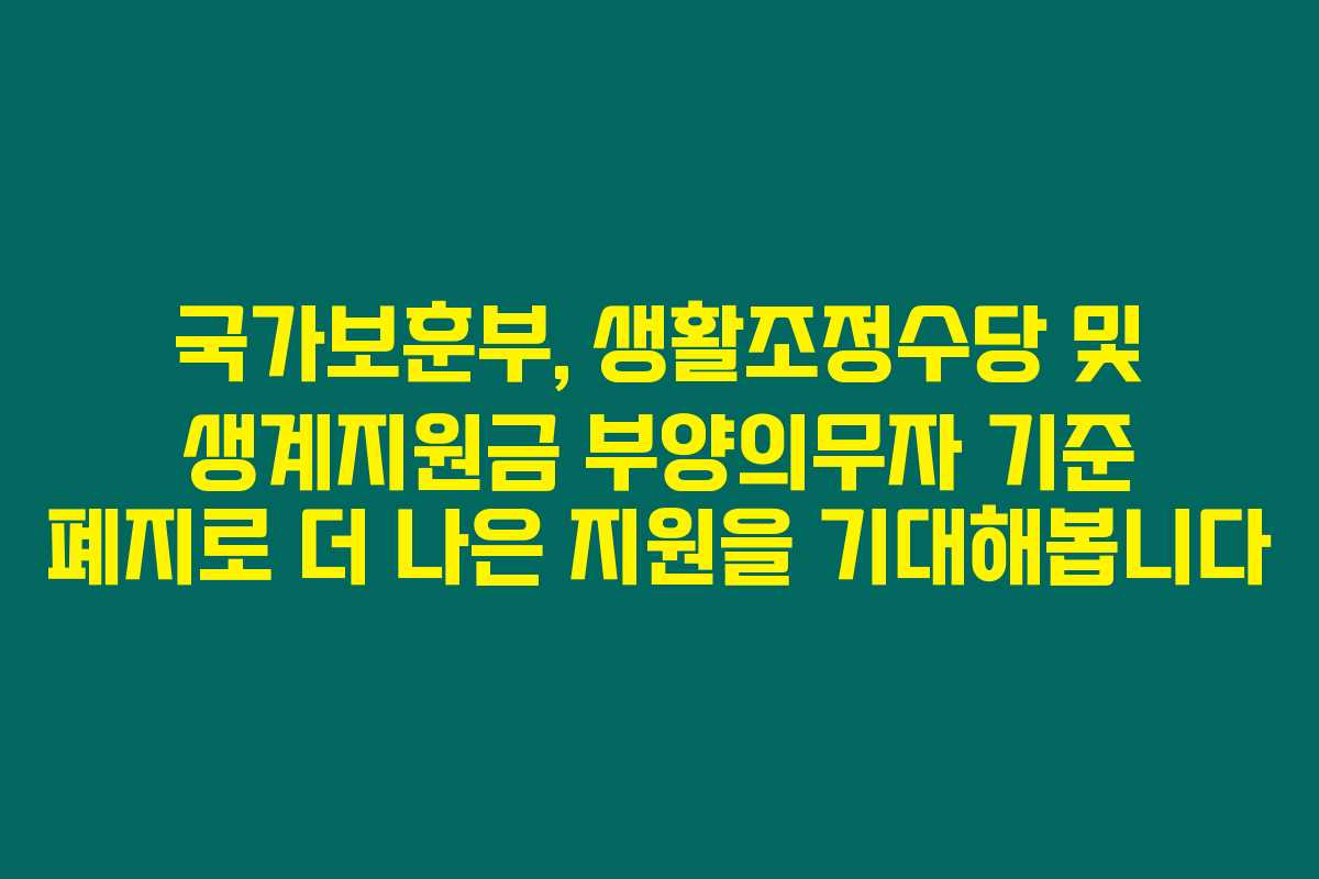 제가 직접 조사해본 바로는, 국가보훈부에서 저소득 국가보훈대상자를 위한 생활조정수당과 생계지원금의 부양의무자 기준을 전면 폐지하기로 결정했습니다. 이로 인해 많은 분들이 더 나은 재정적 지원을 받을 수 있을 것으로 기대되는 변화입니다. 아래를 읽어보시면 이 조치의 배경과 더욱 상세한 내용을 확인할 수 있을 거예요.