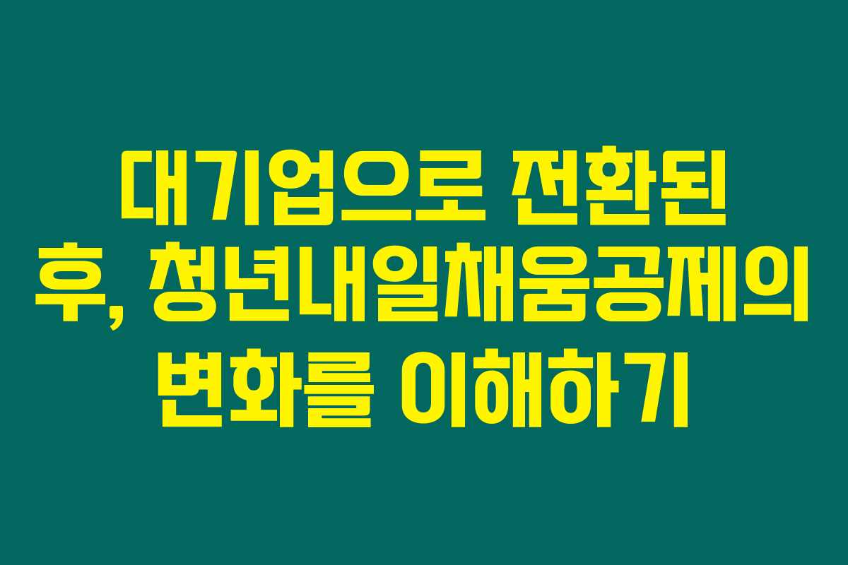 제가 직접 리서치한 바로는, 청년내일채움공제를 통해 청년들이 경제적 안정을 꾀할 수 있는 좋은 기회로 여겨지지만, 회사가 대기업으로 전환되었을 경우의 규정 변화는 많은 청년들에게 혼란을 안기기도 합니다. 아래를 읽어보시면, 이러한 변화와 함께 대기업으로의 전환이 가져오는 청년내일채움공제의 영향을 좀 더 명확하게 이해할 수 있을 것입니다.