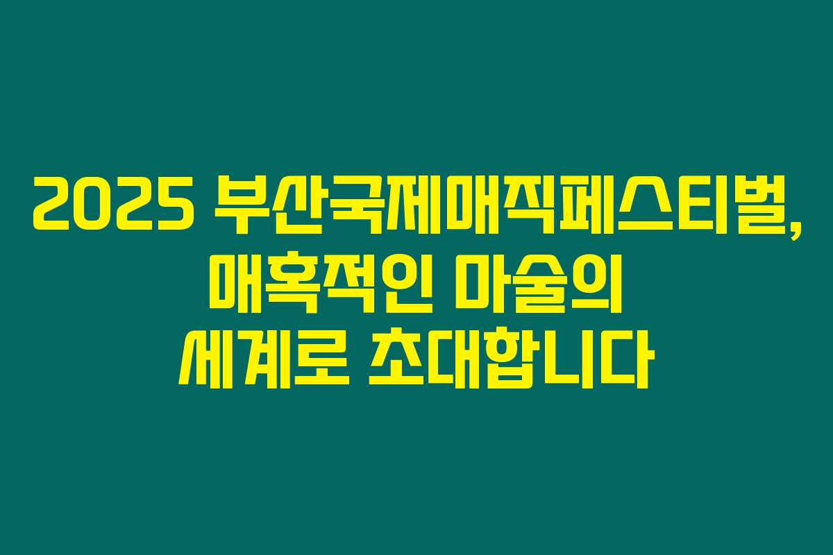 부산에서 펼쳐지는 마술의 대향연인 2025 부산국제매직페스티벌, 믿을 수 없는 마술을 경험하고 싶다면 지금 꼭 알아보세요. 이 축제는 국내외 마술 팬들에게 꿈과 환상의 시간을 선사하는 특별한 자리입니다. 놓칠 수 없는 행사 일정과 티켓 예매 방법을 아래를 읽어보시면 자세히 소개할게요!
