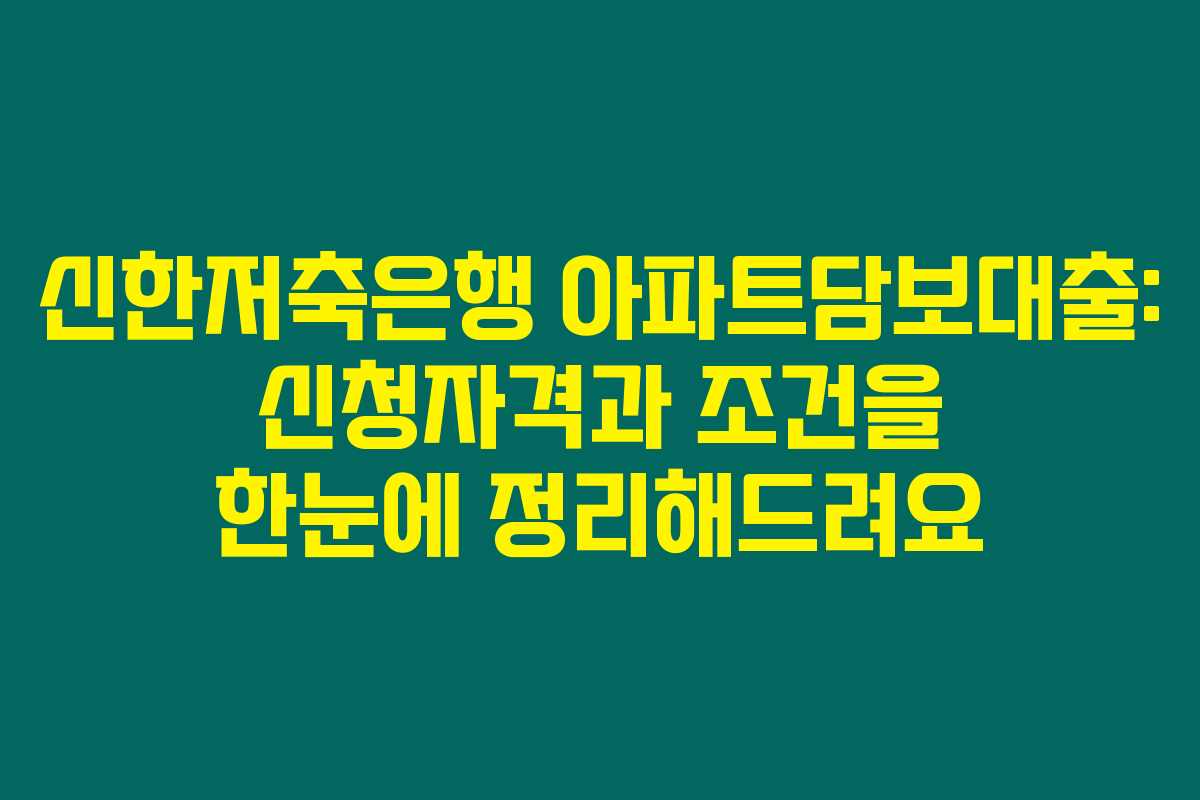 제가 직접 경험해본 결과로는, 신한저축은행 아파트담보대출은 1금융권 대출을 이용하기 어려운 분들에게 유용한 대안이 될 수 있습니다. 이 대출의 신청자격과 대출조건을 아래를 읽어보시면 한눈에 정리된 정보를 얻으실 수 있습니다.