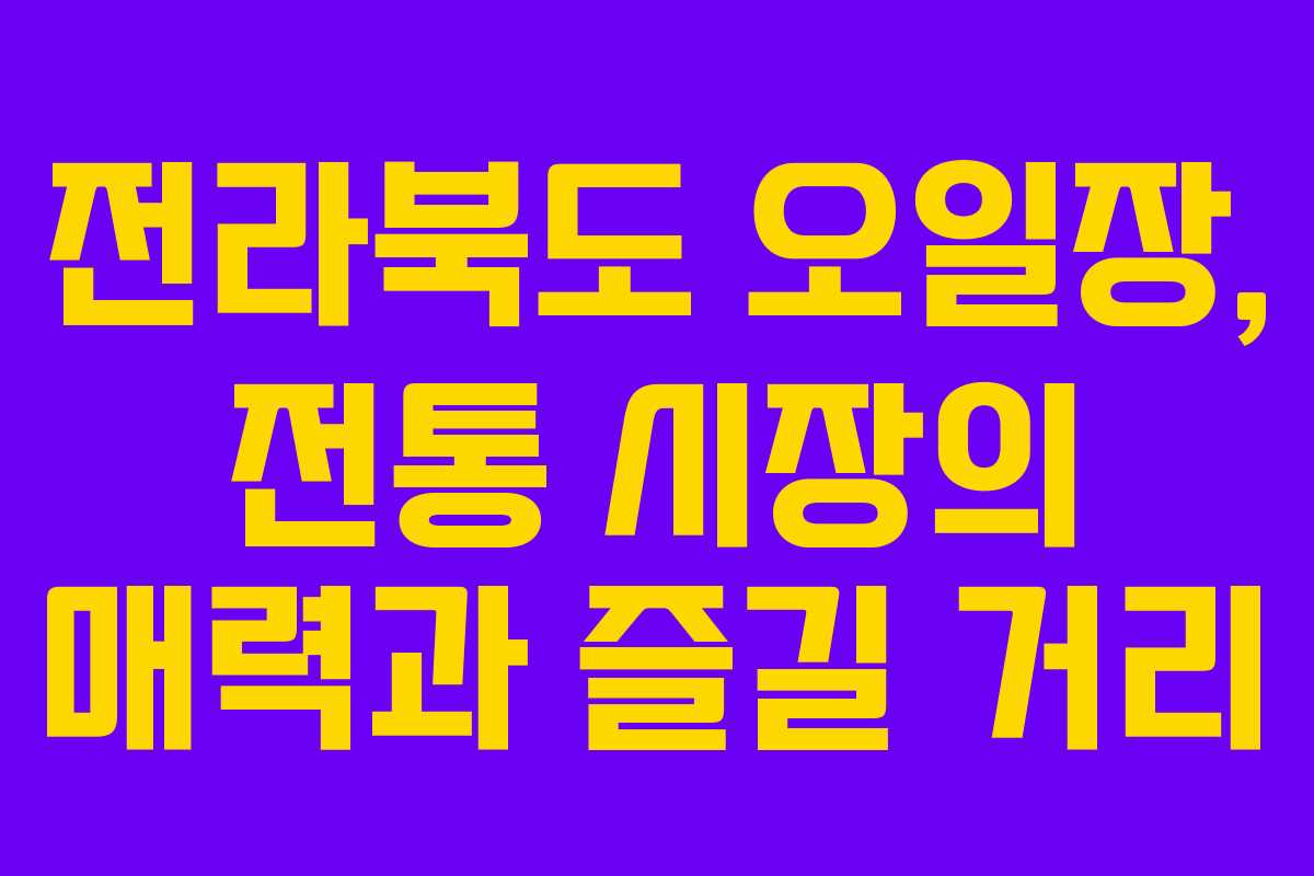 전라북도의 오일장은 지역의 전통을 체험하고 신선한 농산물을 구매할 수 있는 특별한 장소이다. 이러한 시장은 지역 경제 활성화에 기여하고, 방문객들에게는 잊지 못할 경험을 선사한다. 매월 정해진 장날에 맞춰 방문하여 다양한 지역 특산물을 직접 체험하는 것은 전라북도의 매력을 느낄 수 있는 좋은 기회가 될 것이다.