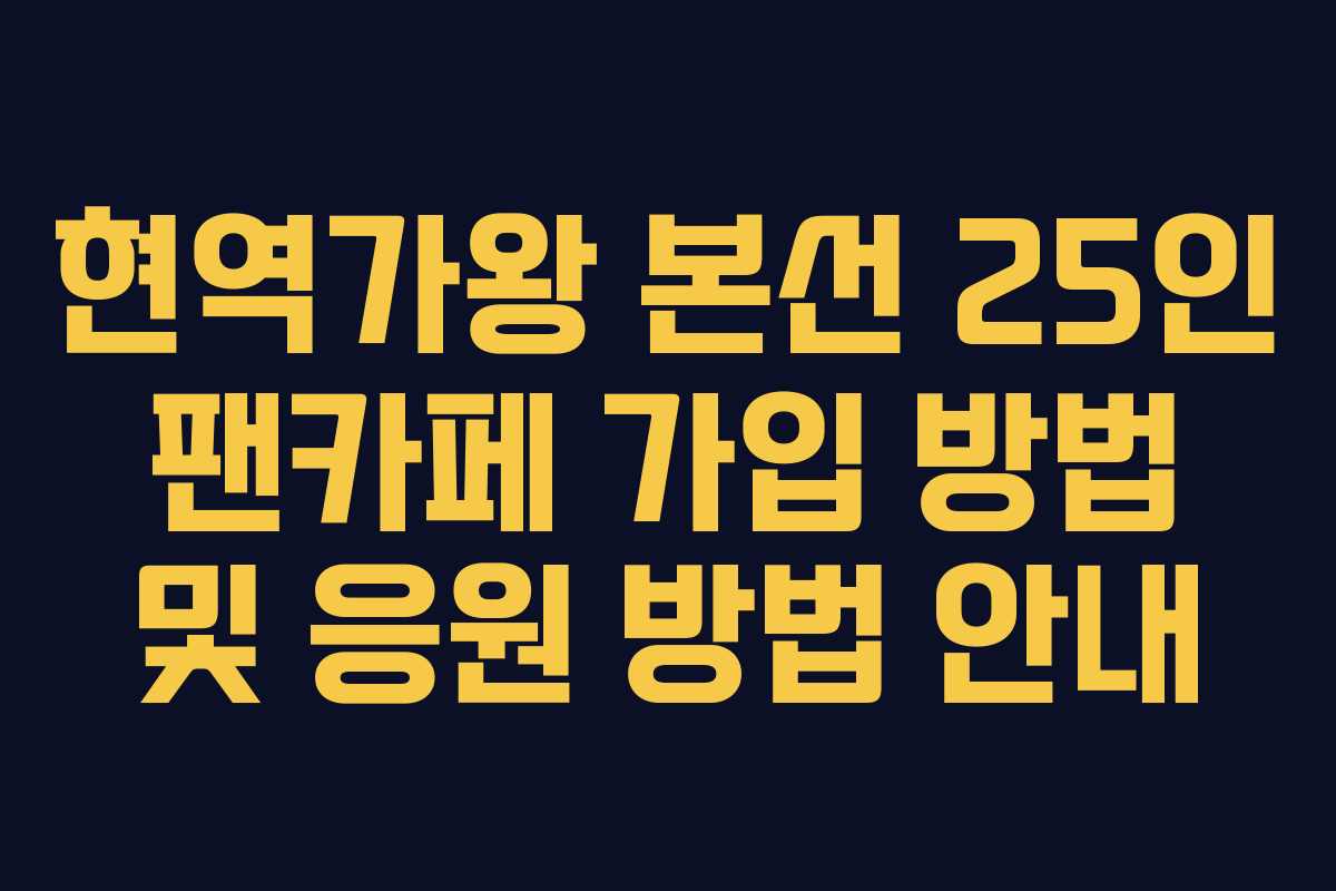 2025년 1월 9일 기준으로, 현역가왕 본선에서 25명의 진출자가 확정되었습니다. 이들은 예선에서 치열한 경쟁을 뚫고 올라온 뛰어난 실력을 가진 가수들입니다. 이제 그들의 팬으로서 힘을 실어주는 것이 중요해졌습니다. 본선 진출자 각각의 팬카페에 가입하여 응원의 메시지를 전하는 방법과 유의사항을 정리하였습니다.