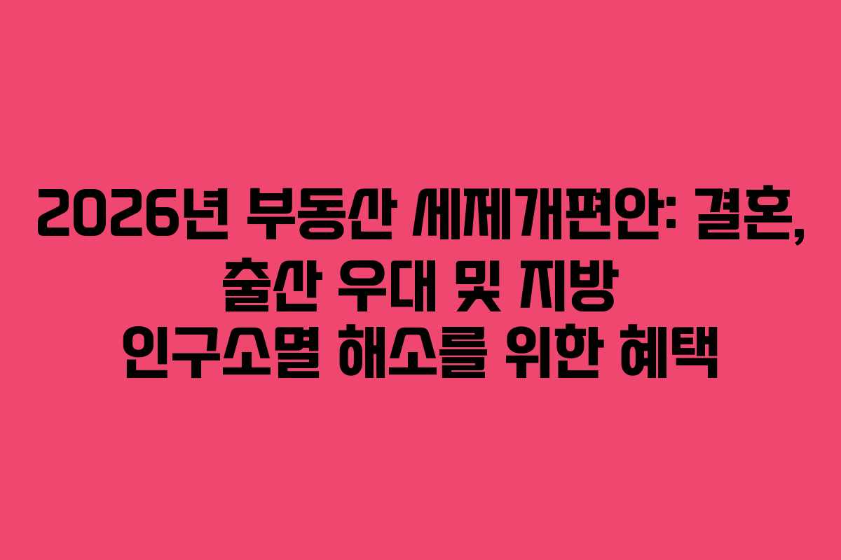 2026년 부동산 세제개편안은 결혼 및 출산을 장려하고 지방 인구소멸 문제를 해결하기 위한 다양한 혜택을 포함하고 있다. 이러한 변화는 특정 세금 부담을 줄이고, 주택 시장의 활성화를 목표로 하고 있다. 이 글에서는 2026년의 주요 세제 변경 사항을 살펴보고, 이로 인해 기대되는 효과를 분석해보겠다.